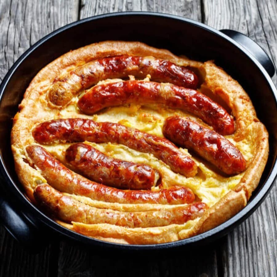 Toad in the hole: Sausages and Yorkshire pudding. British comfort at its finest!
